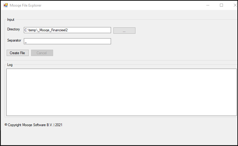 Door op de knop ‘Create file’ te klikken wordt een CSV-file (MooqeFileExplorer.csv) geproduceerd die in de opgegeven directory geplaatst wordt. De CSV-file bevat de volgende informatie: