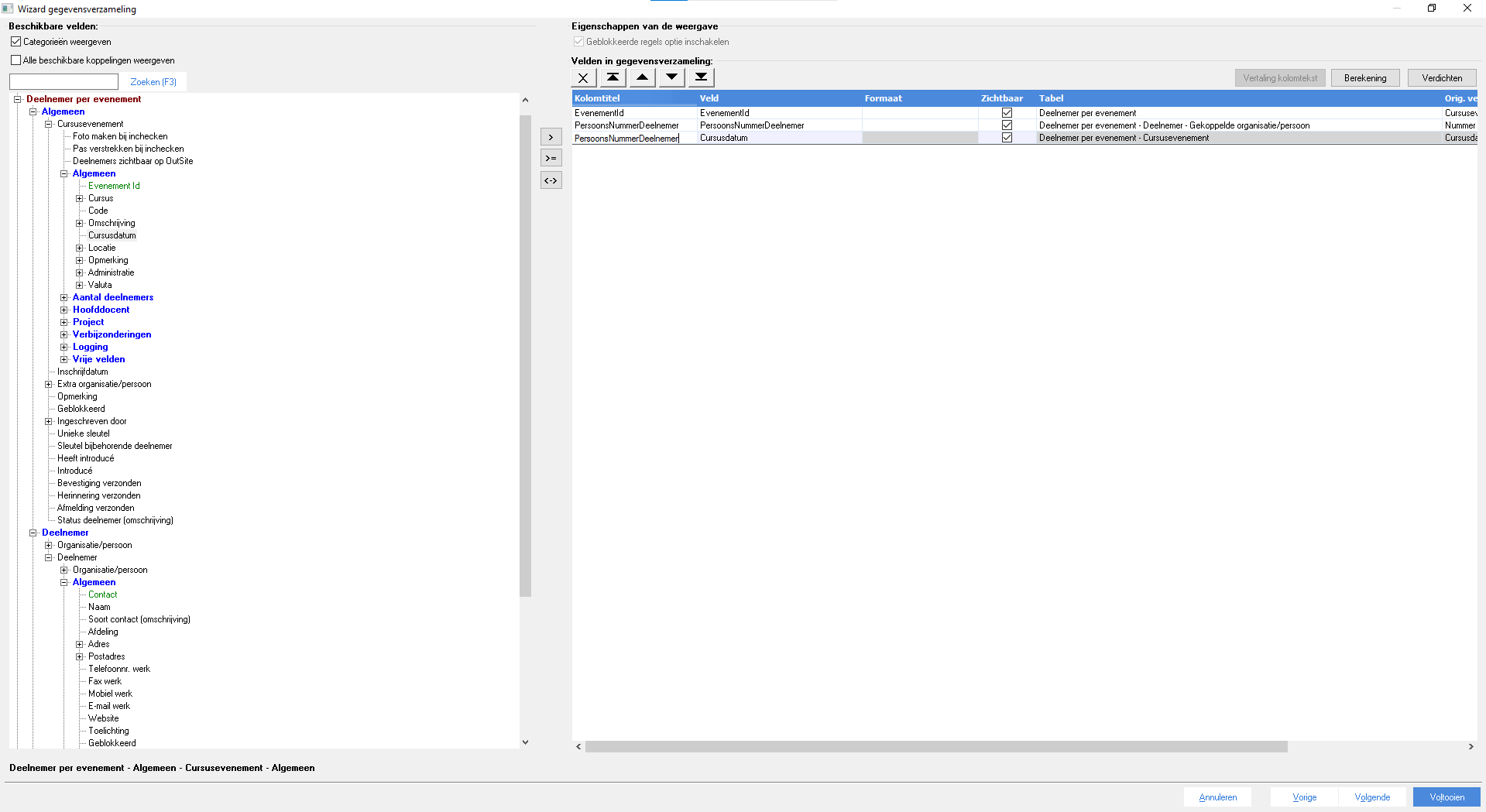 Zorg dat de volgende velden in de gegevensverzameling zitten: