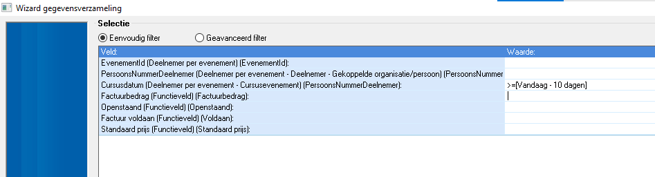 Nadat de velden aan de gegevensverzameling toegevoegd zijn gaan we verder met het instellen van de filtering van de data.