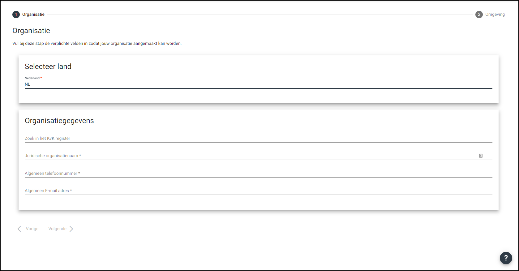 In bovenstaand scherm moet als eerste opgegeven worden wat het land van de organisatie is. Na selectie van het land, verschijnen de overige velden.