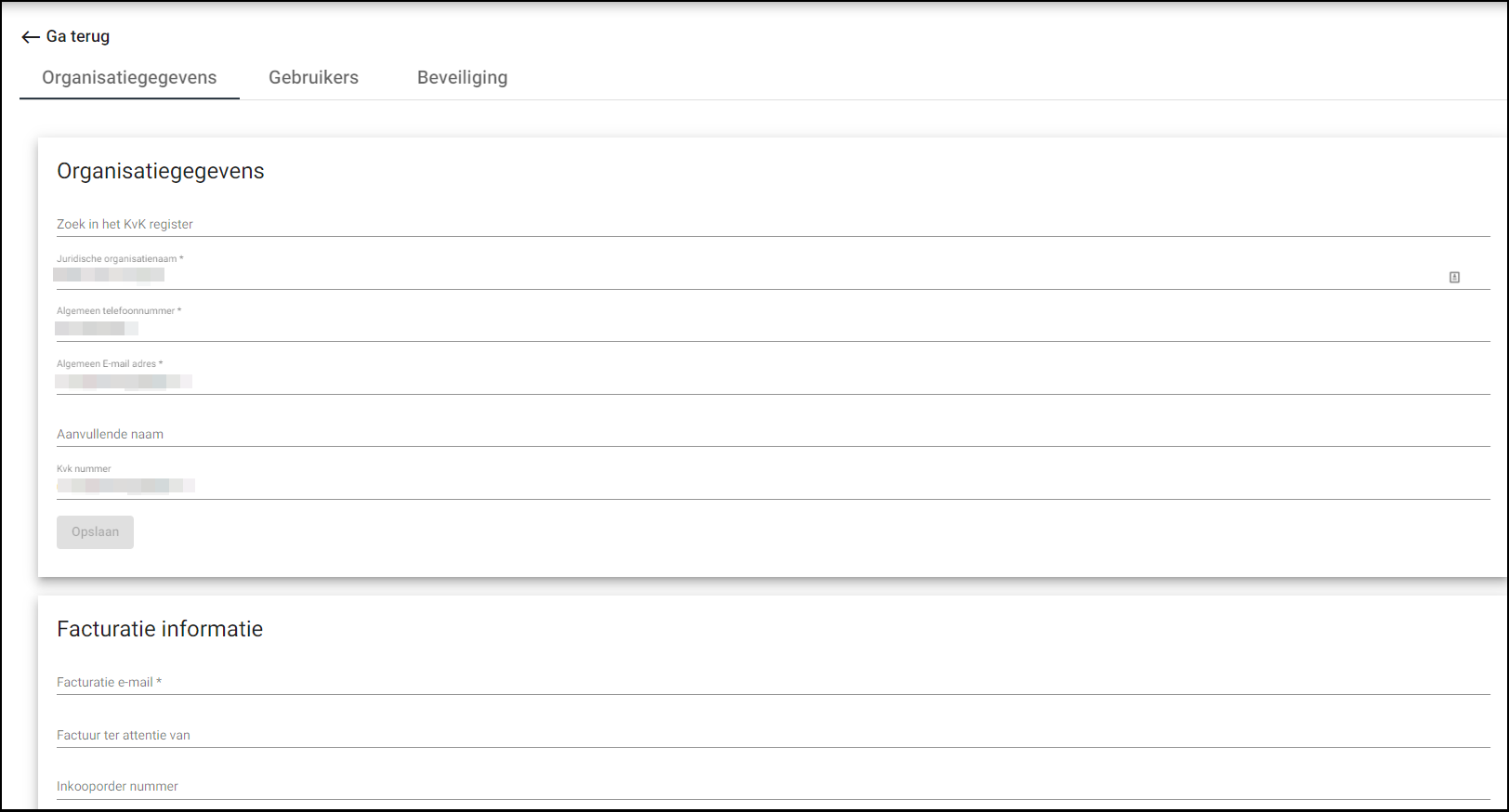 Afhankelijk van het licentie type dat de organisatie heeft, kunnen hier de algemene gegevens met betrekking tot een organisatie aangepast worden. Denk hierbij aan zaken zoals de naam en facturatie email adres.