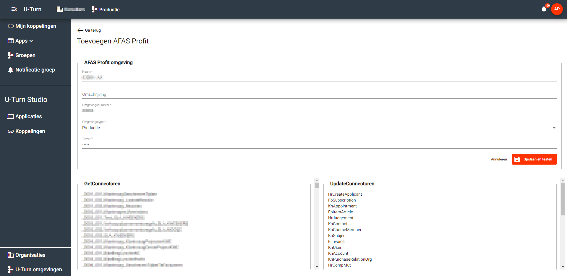 Na het invullen van alle gegevens klik je op ‘Opslaan en testen’. Vervolgens worden de Get- en Updateconnectoren opgehaald die in AFAS vastgelegd zijn voor de token.