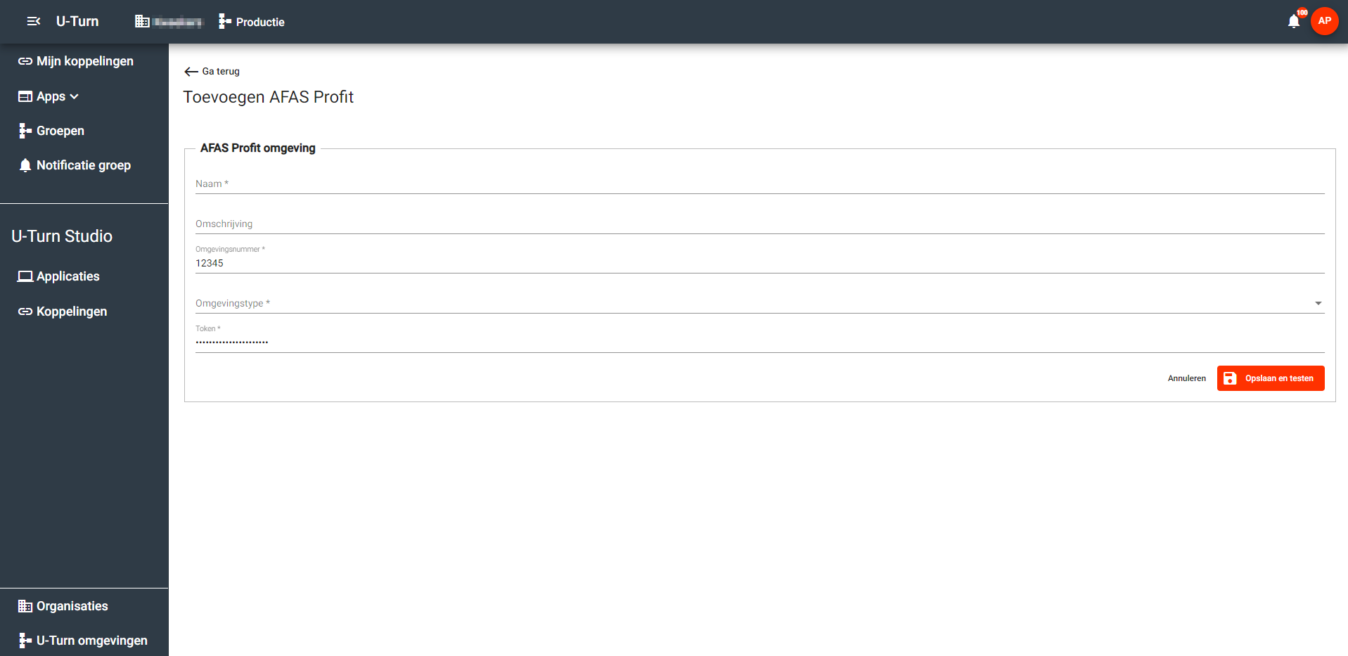 Binnen dit type applicatie leg je een AFAS omgeving vast door middel van het omgevingsnummer en de token.