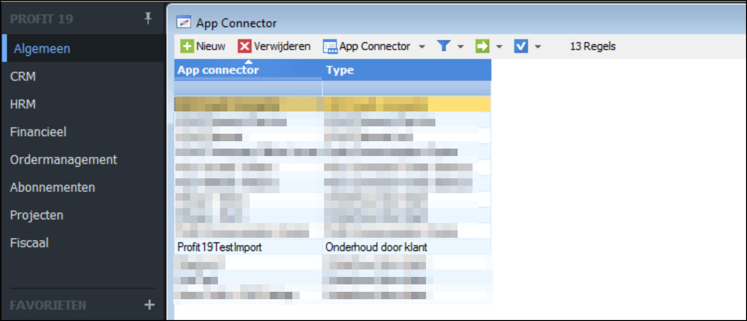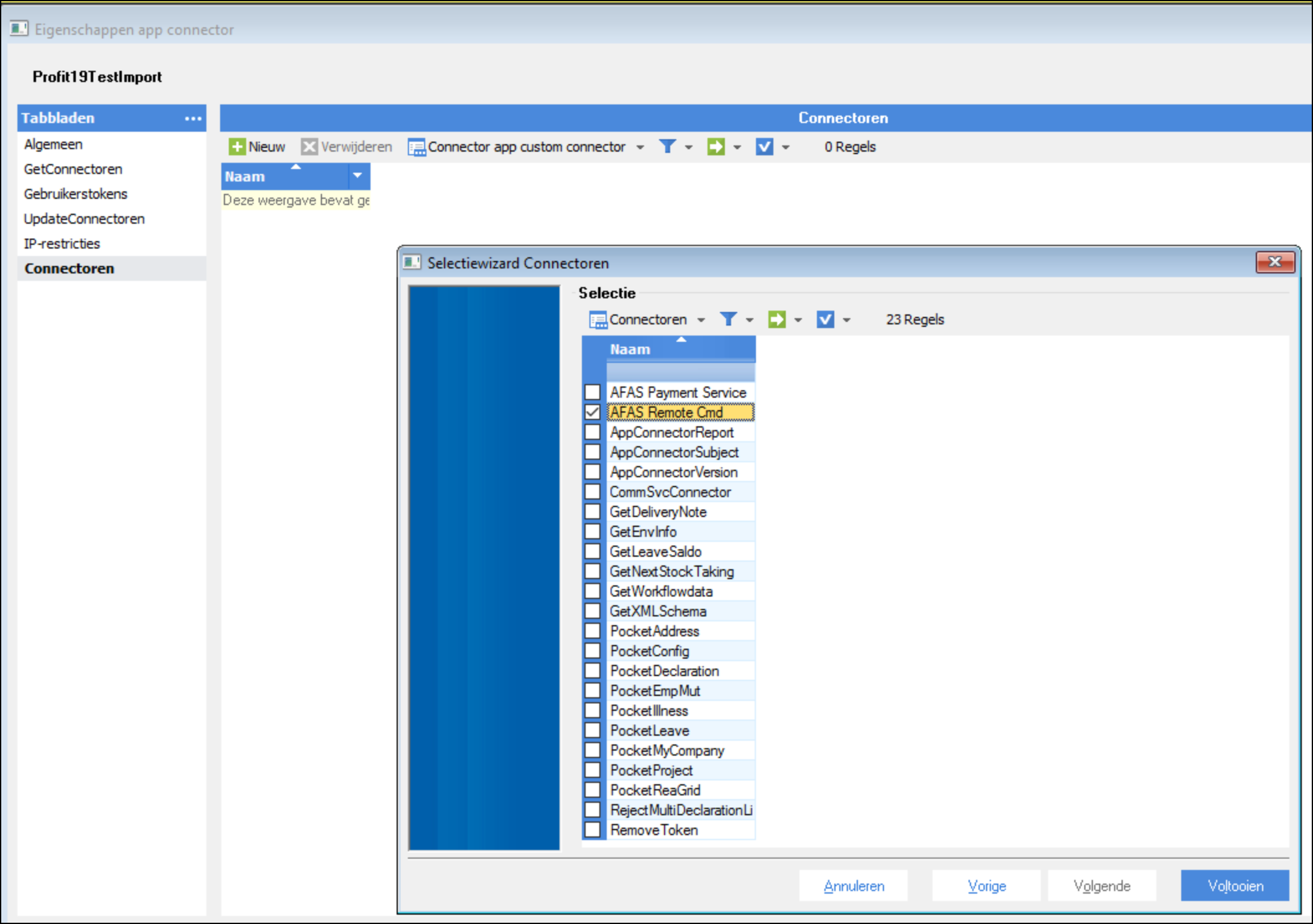 Vanaf AFAS Profit 19 is het noodzakelijk om in geval van een import koppeling, de juiste recehten in te stellen in AFAS Profit. In de AppConnector dient bij het tabblad Connectoren de “AFAS Remote Cmd” toegevoegd te worden. Je doet dit als volgt: