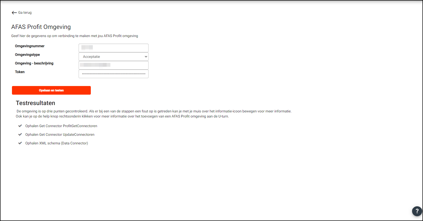 Zorg er wel voor dat je al in de juiste organisatie en U-turn omgeving zit voordat je een AFAS omgeving gaat toevoegen, want de AFAS omgeving wordt alleen toegevoegd aan de U-turn omgeving waar jij je in bevindt op het moment dat je de AFAS omgeving toevoegt.