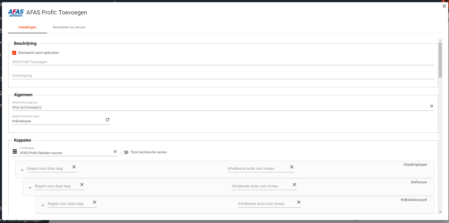 Dit is het bouwblok om iets te versturen naar AFAS. Dit kan toevoegen, bijwerken of verwijderen zijn. De schermen kunnen iets verschillen van dit voorbeeld, maar zijn nagenoeg gelijk aan elkaar.