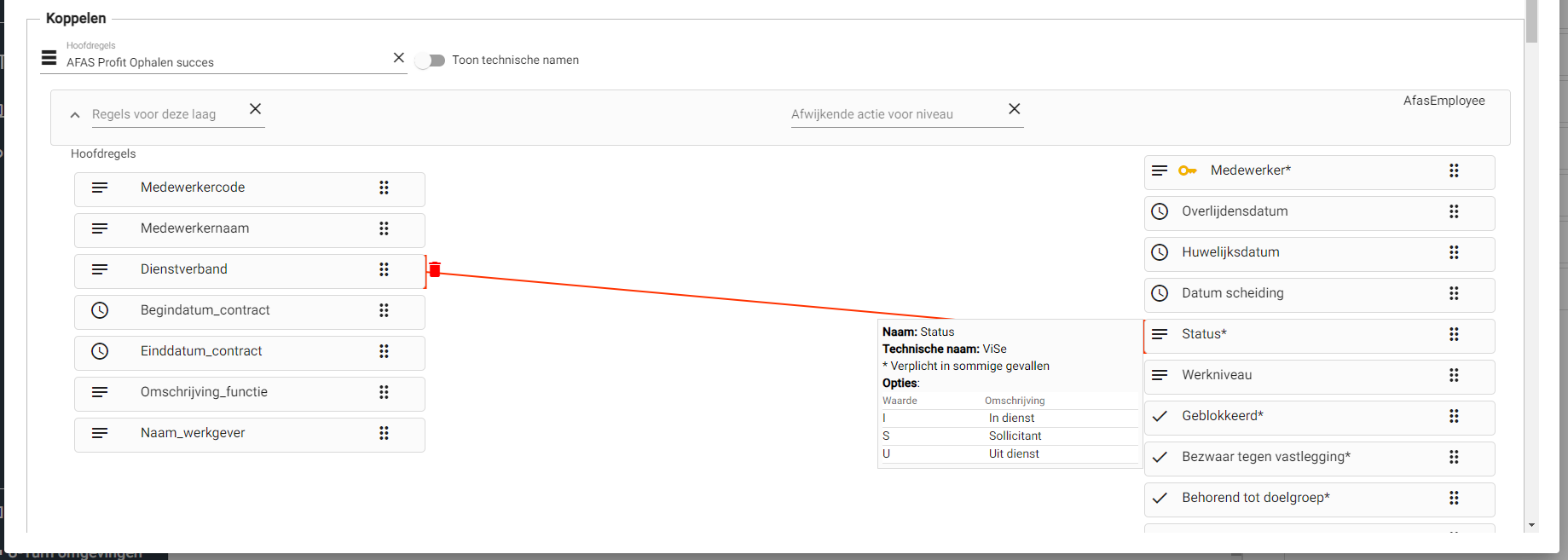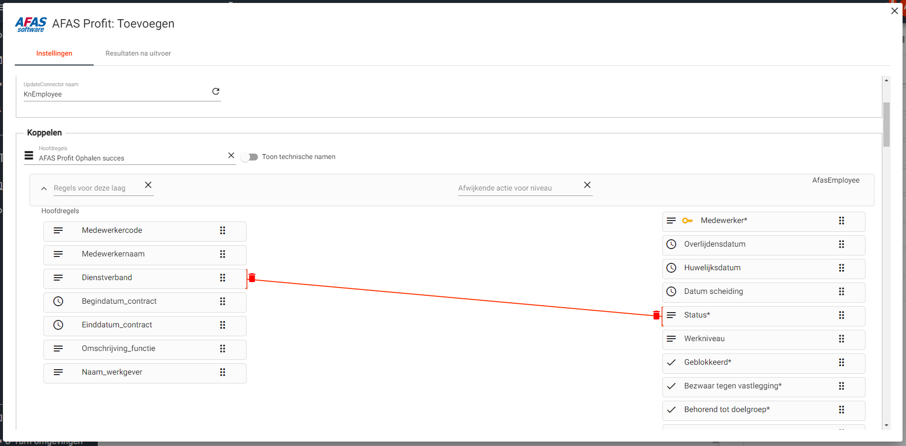 Meestal zullen de regels uit één bron of dataset verstuurd worden naar AFAS. Het is ook mogelijk om data vanuit verschillende datasets of bronnen te versturen naar AFAS, en een relatie te leggen tussen die verschillende datasets. Wanneer dit gewenst is, selecteer je op het niveau waar dit voor geldt een andere dataset onder ‘Regels voor deze laag’. Wanneer je dat gedaan hebt zal er een extra knop verschijnen om een relatie te leggen tussen de datasets. Als deze relatie gelegd is zal je in het linker gedeelte van het scherm de velden uit beide datasets zien om te koppelen.
