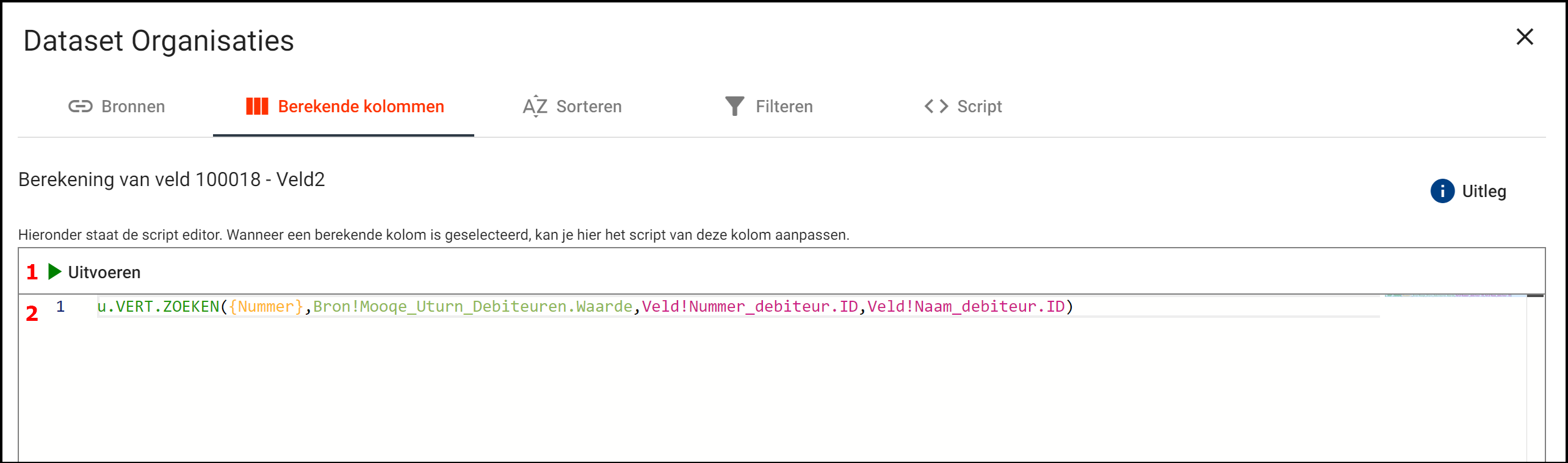 Wanneer je een formule, script of iets anders in de editor hebt gezet, kan je via de uitvoeren knop testen of de uitkomst het gewenste resultaat heeft. Deze knop voert alleen de berekening uit en verstuurt bijvoorbeeld geen gegevens naar een andere applicatie.