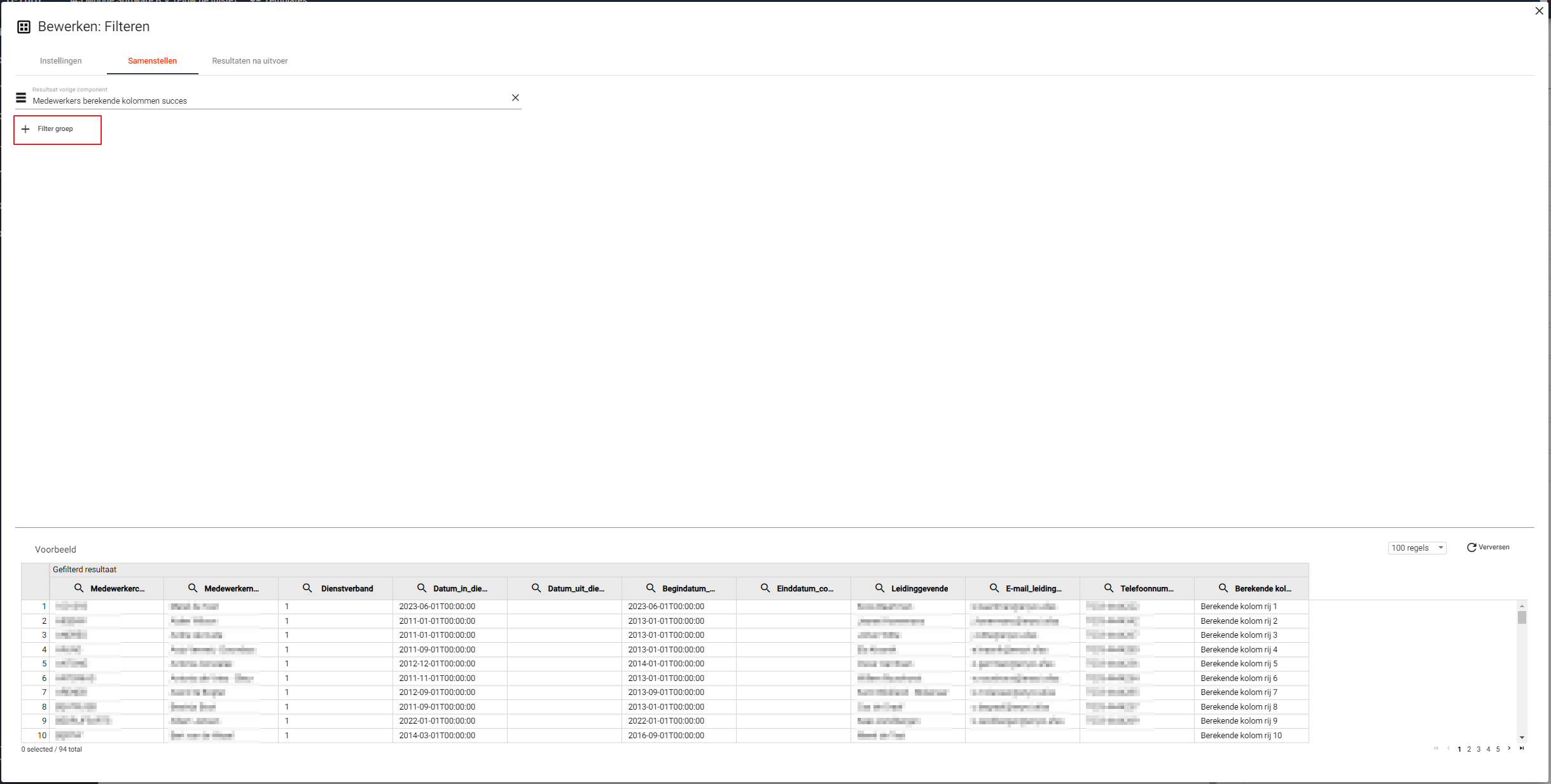 Wanneer de dataset geselecteerd is zal in het onderste gedeelte van het scherm de dataset weergegeven worden, en maak je met de knop ‘+ Filter groep’ een nieuwe filtergroep en filter aan.