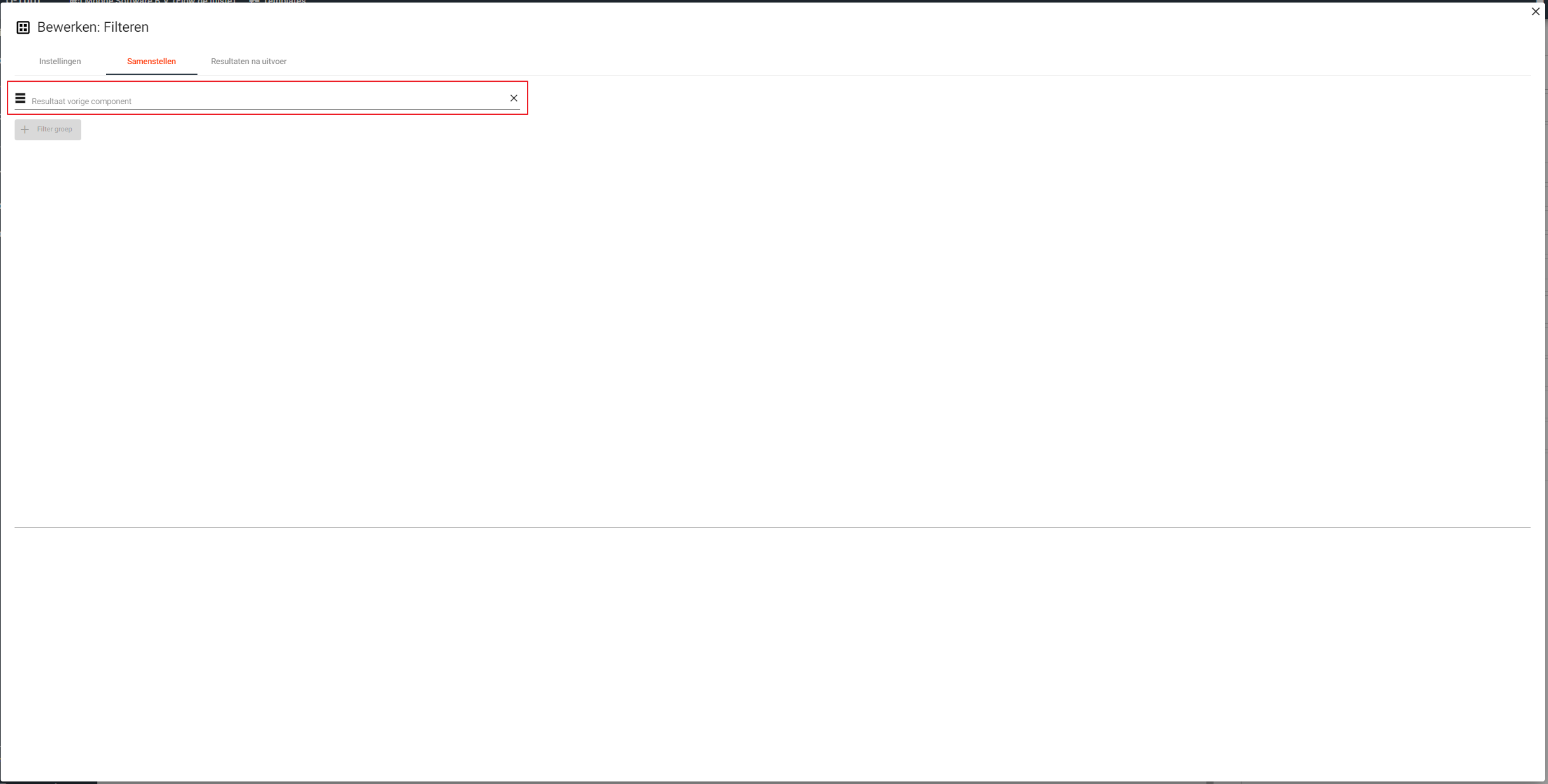Wanneer dit component geopend wordt zal het initieel leeg zijn. Selecteer in ‘Resultaat vorige component' een dataset uit je koppeling waarop je wil gaan filteren.