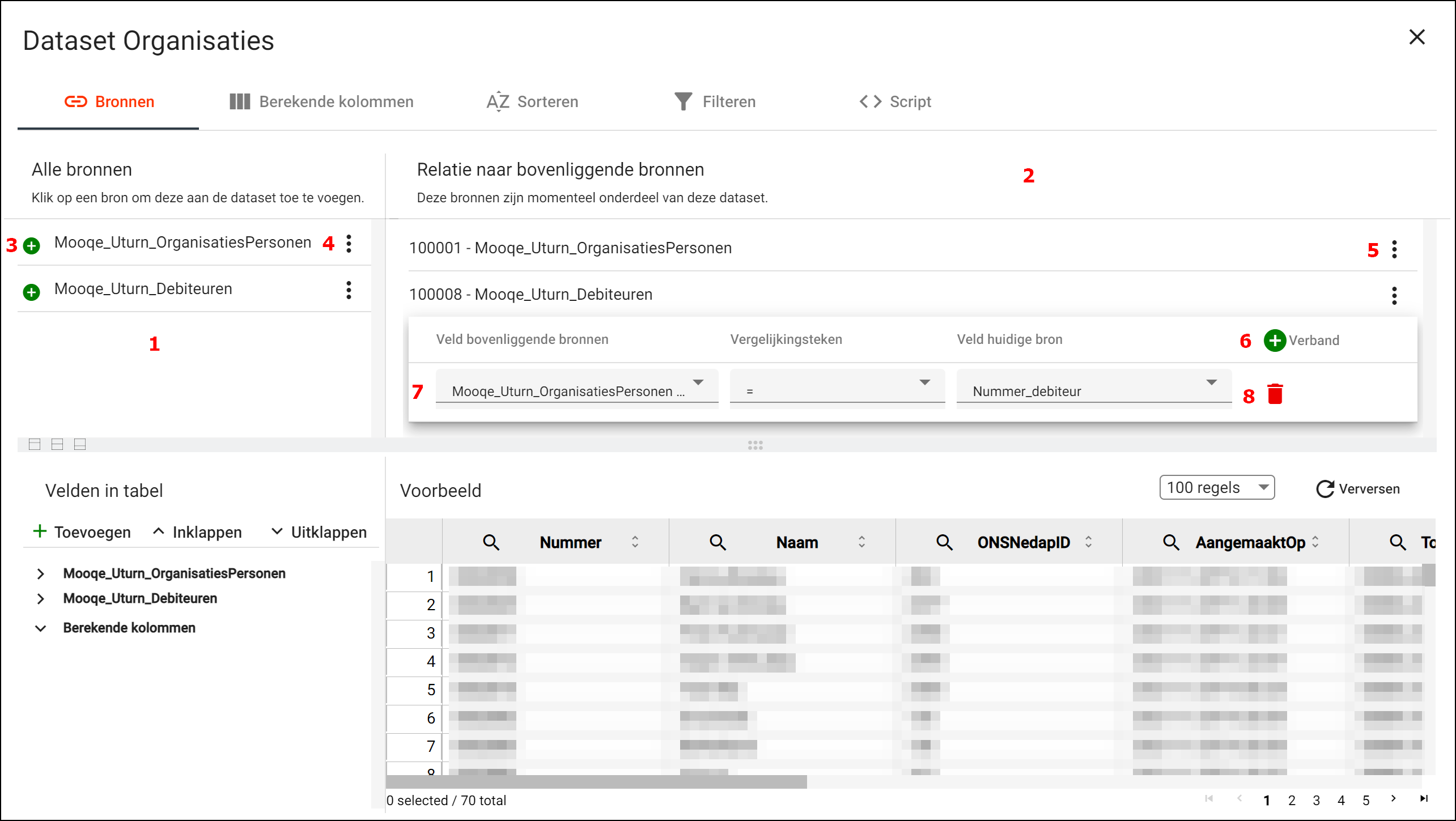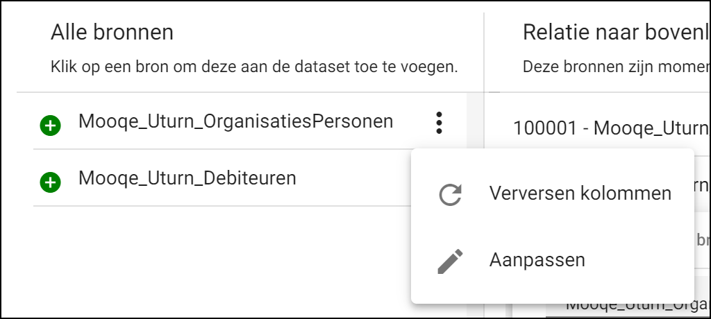 In het rechter deel van het scherm, staan alle bronnen welke in deze dataset gebruikt worden en de relaties tussen deze bronnen.