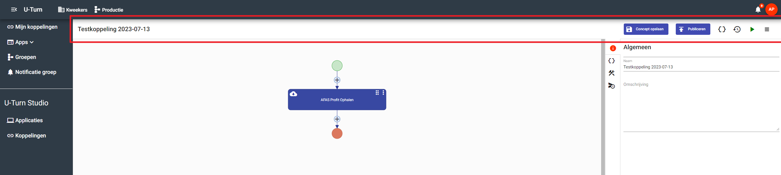 In het control center kunnen een aantal zaken over uitvoer en opslaan van de koppeling geregeld worden. Het control center is te vinden bovenaan de pagina wanneer een koppeling geopend is: