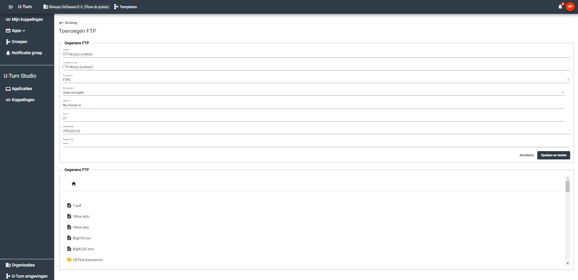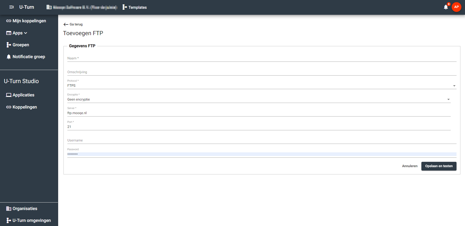 Voeg minimaal het type, de server, poort, gebruikersnaam en wachtwoord van de FTP verbinding in en klik vervolgens op ‘Opslaan en testen’