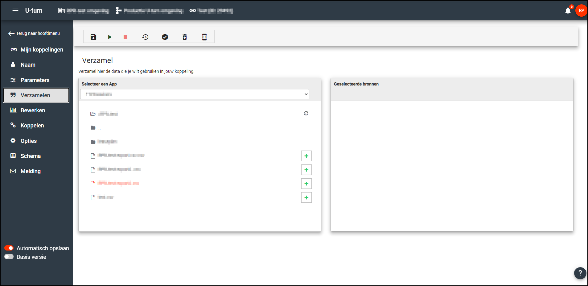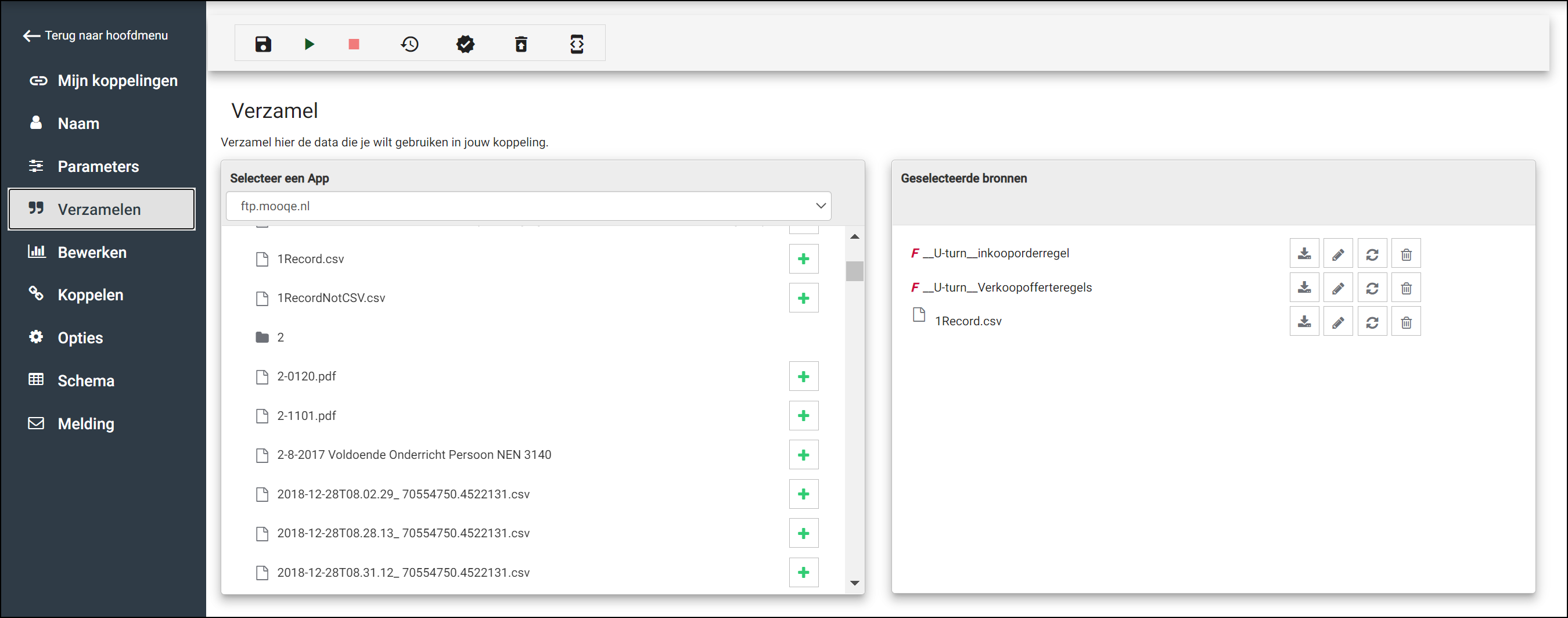 Files vanaf een FTP-server kunnen ook als bron van een koppeling toegevoegd worden. Kies in de dropdown ‘Selecteer een APP’ een van de FTP-apps die binnen deze omgeving gedefinieerd zijn. (Voor informatie over het toevoegen van een FTP-app zie FTP )
