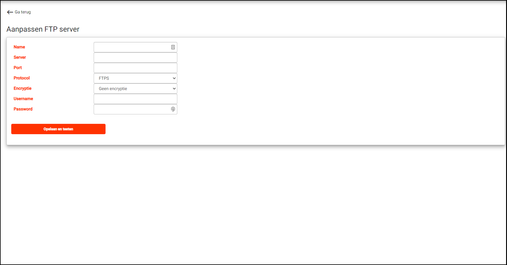 Klik nadat alle gegevens ingevuld zijn op de button ‘Opslaan en testen’ om te controleren of er met de ingevulde gegevens verbinding gemaakt kan worden met de FTP server.