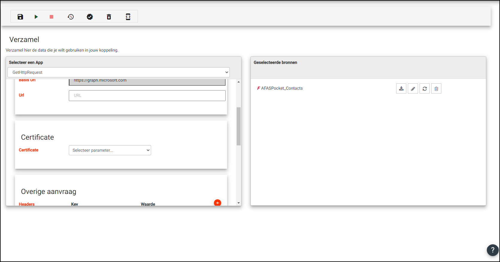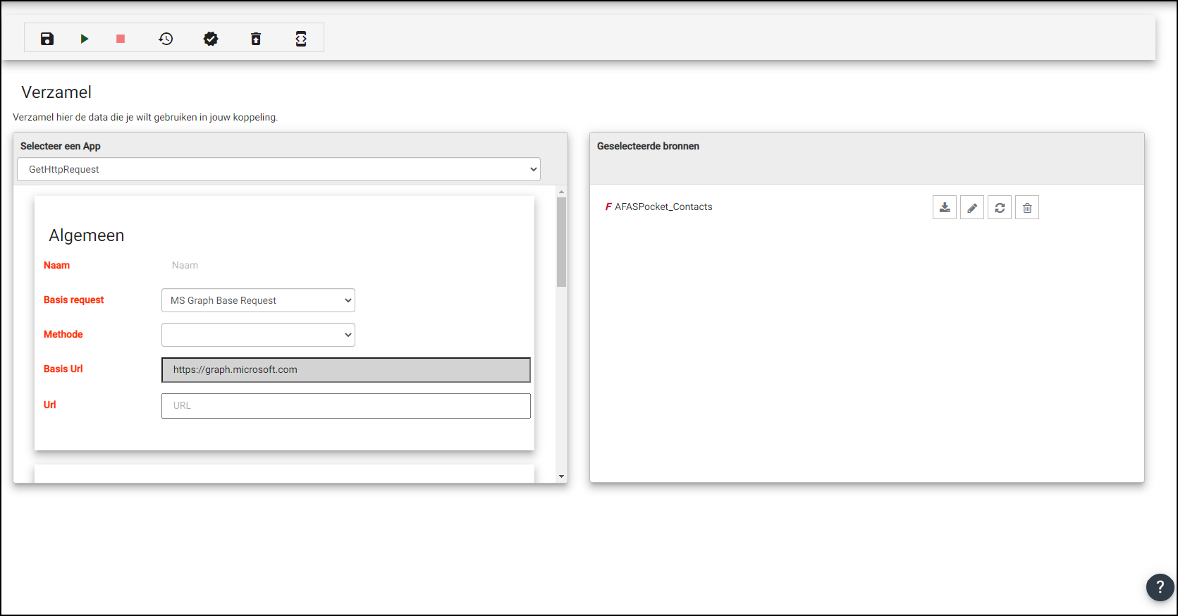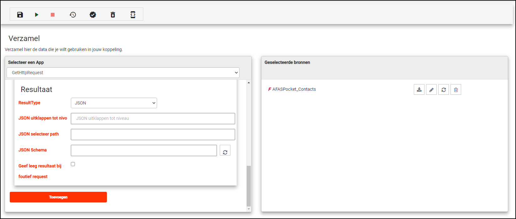 Het is ook mogelijk om een externe service aan te roepen door middel van een HTTP request. Selecteer hiervoor de optie GetHttpRequest in het linker paneel van de tab 'Verzamelen'.
