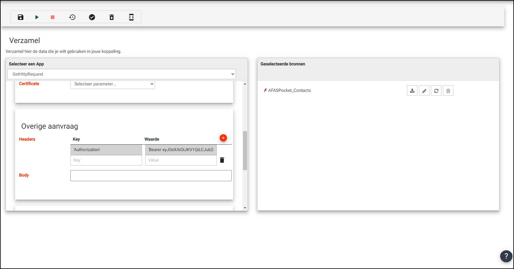In dit blok kan overige informatie (Headers en Body) die nodig is om het API-request uit te voeren opgegeven worden.