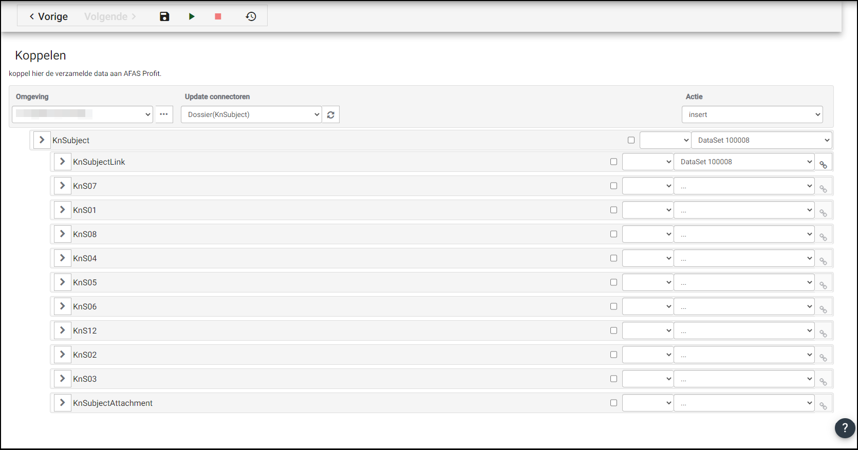 Vul bij de 1e regel (KnSubject) en ook het niveau eronder (KnSubjectLink) de dataset aan de rechterkant. En koppel ook de 2 datasets zodat de juiste regels bij elkaar gevonden kunnen worden.