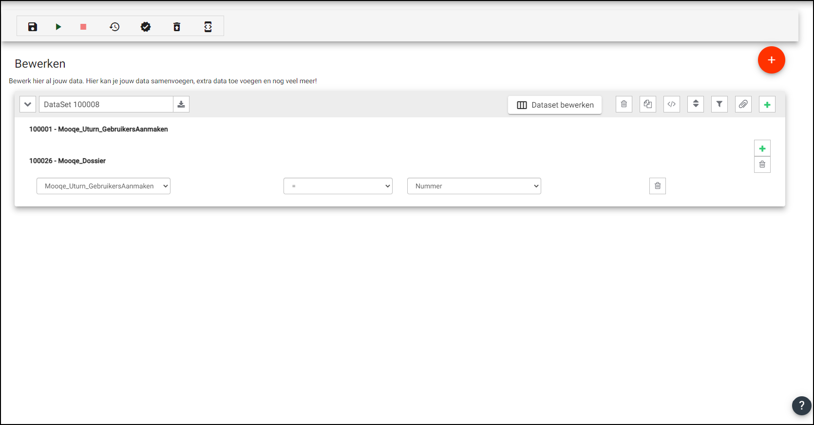 Voeg aan de bestaande dataset de nieuwe bron toe op het plusje te klikken en voeg vervolgens de koppeling tussen de bronnen toe. Je koppelt hier de sleutelvelden aan elkaar. Zo kan je vergelijken welke gegevens zijn ingestuurd, en welke nog ingestuurd moeten worden.