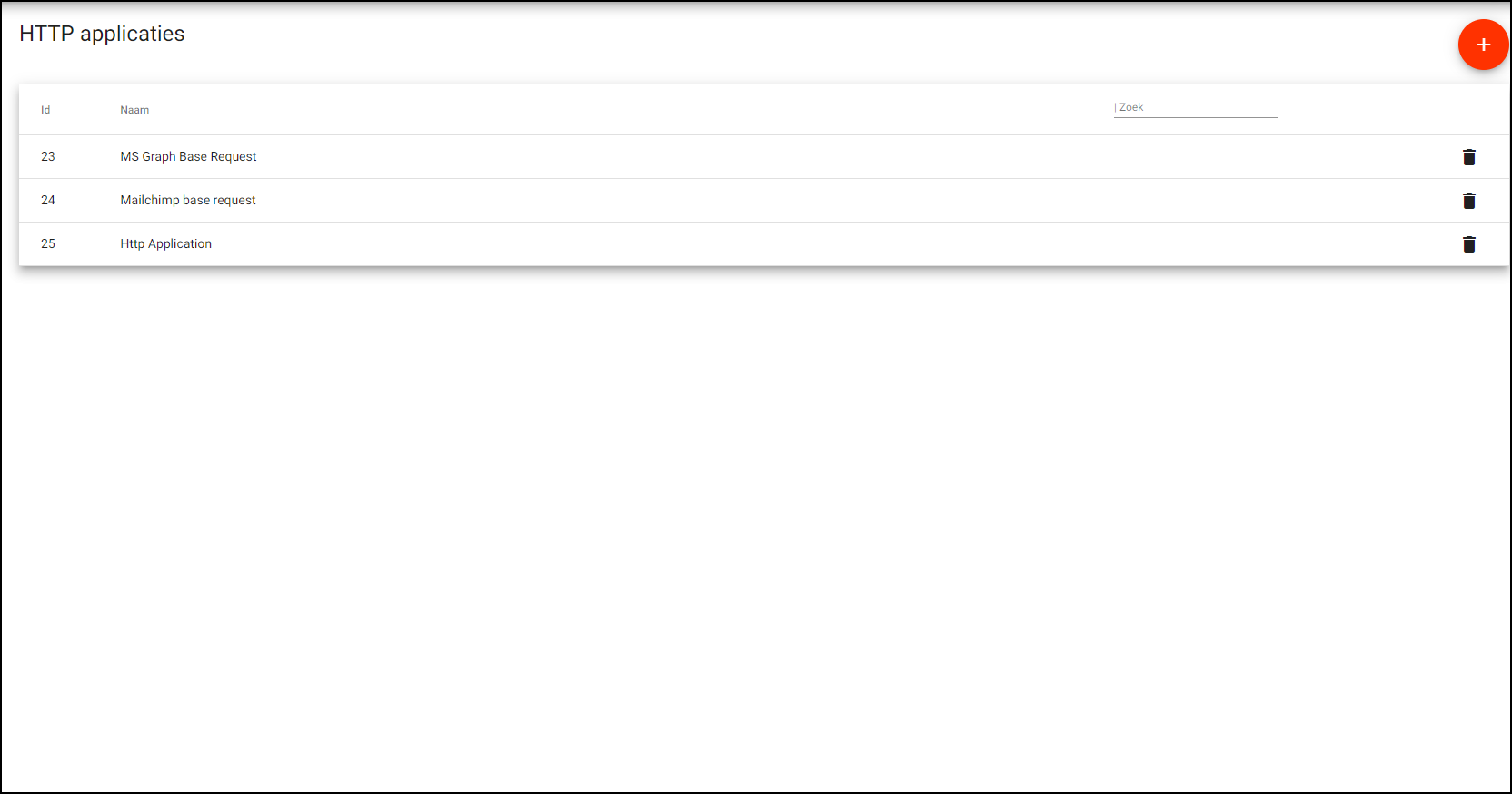 Wanneer je via het navigatie menu naar Apps gaat en vervolgens kiest voor HTTP kom je in het overzicht scherm terecht waar alle gedefinieerde HTTP-apps in een tabel getoond worden. Hier kun je nieuwe HTTP-apps toevoegen en bestaande HTTP-apps bewerken of verwijderen.
