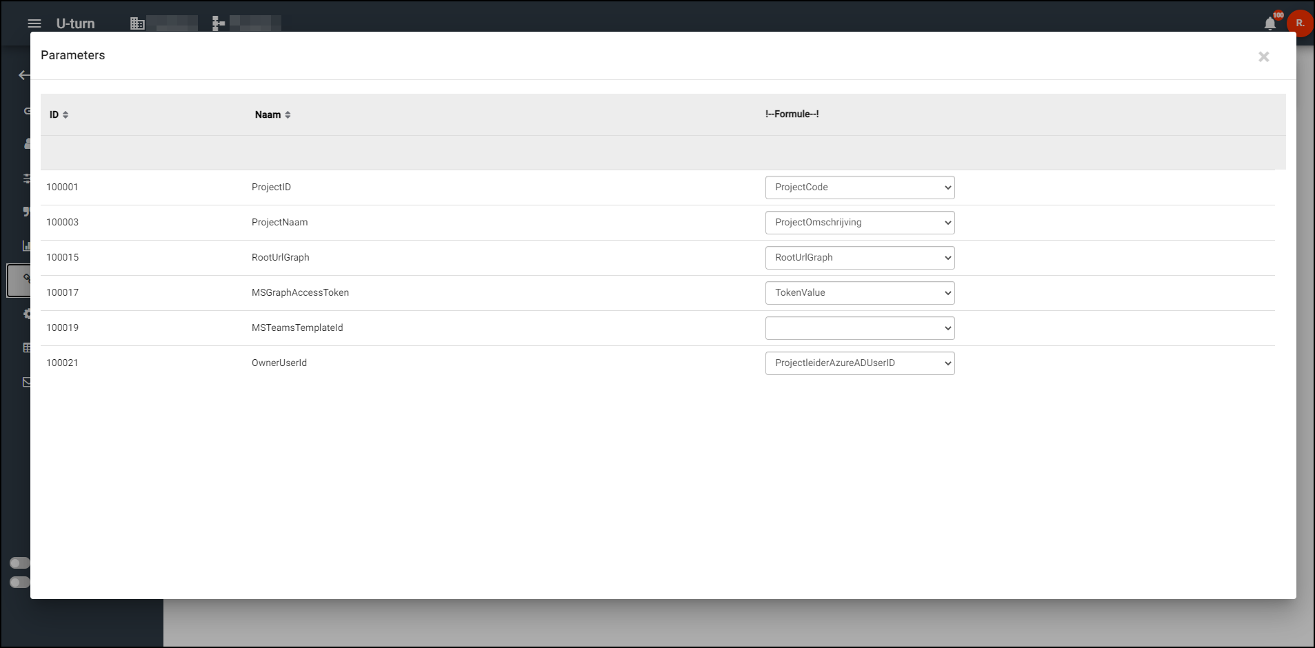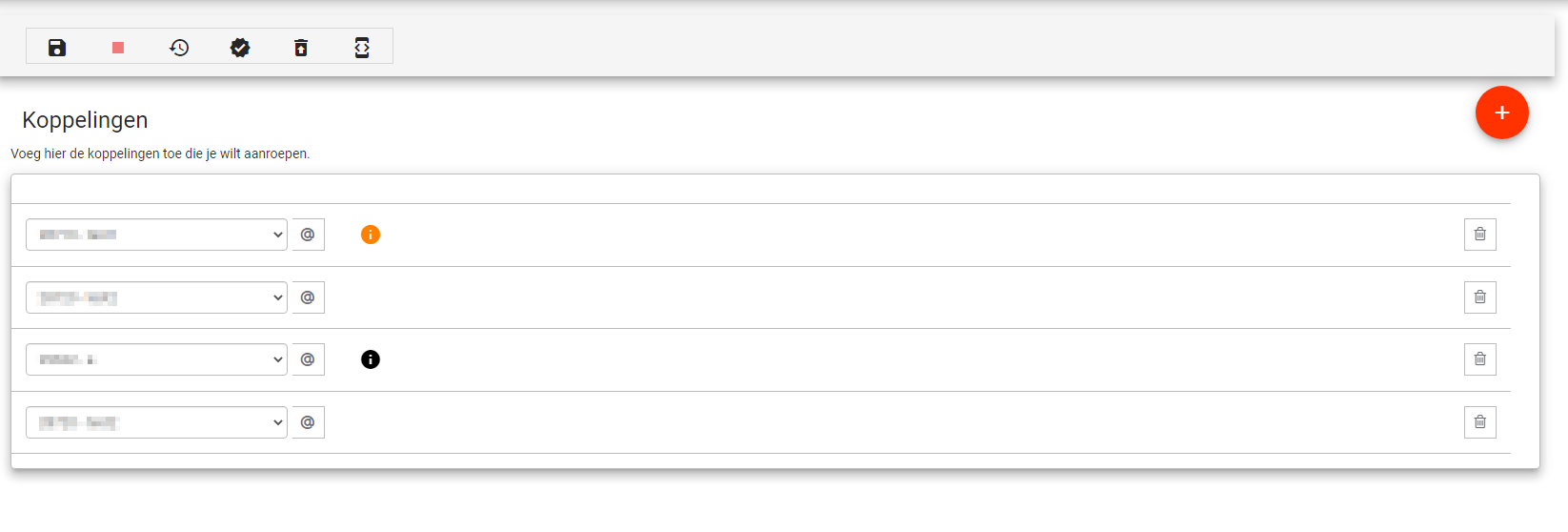 Indien er bij de aan te roepen koppeling parameters gedefinieerd zijn kun je ook aangeven welke waarden er optioneel meegestuurd moeten worden. Klik hiervoor op de '@'-button achter de koppeling. Nadat een koppeling is geselecteerd wordt hier ook zichtbaar of de koppeling restricties bevat. Het oranje informatie-icoon betekent dat het een gratis koppeling betreft, een zwart informatie-icoon houdt in dat de koppeling inactief is. Als er geen informatie-icoon achter de koppeling staat dan heeft deze geen restricties.