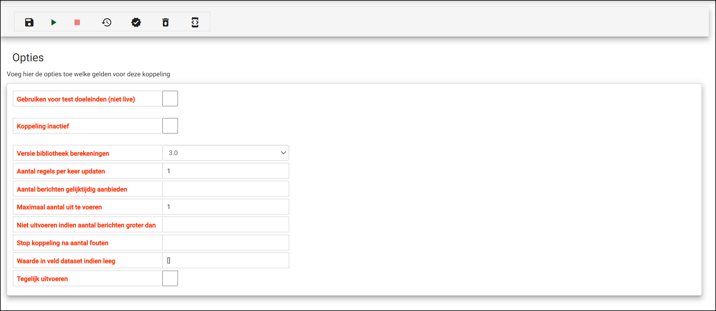 Deze optie biedt de mogelijkheid om de koppeling automatisch te laten stoppen indien een maximaal aantal fouten zich heeft voorgedaan. Stel je biedt 100 berichten aan. Je hebt deze optie op 50 ingesteld. De eerste 50 berichten leveren een fout op. In dat geval zal de koppeling in het geheel worden beëindigd. Dit betekent dus dat er 50 berichten aan AFAS Profit zijn aangeboden. De overige berichten zijn niet aangeboden.