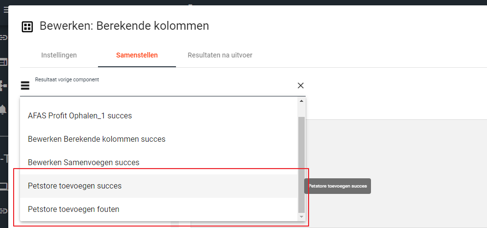 Het resultaat hiervan is dat een bouwblok meerdere verwijzingen kan hebben. Wanneer je in een bouwblok naar een ander bouwblok verwijst zie je dat de betreffende dataset meerdere varianten kan hebben. In het voorbeeld hieronder is een bouwblok gebruikt voor het versturen van data naar een applicatie. Hieruit zijn twee resultaten gekomen, namelijk ‘[naam bouwblok] succes' en '[naam bouwblok] fouten’. Doordat deze varianten afzonderlijk te benaderen zijn is het mogelijk om een vervolgcomponent uit te voeren die bijvoorbeeld alleen maar iets doet met de regels die fout gegaan zijn.