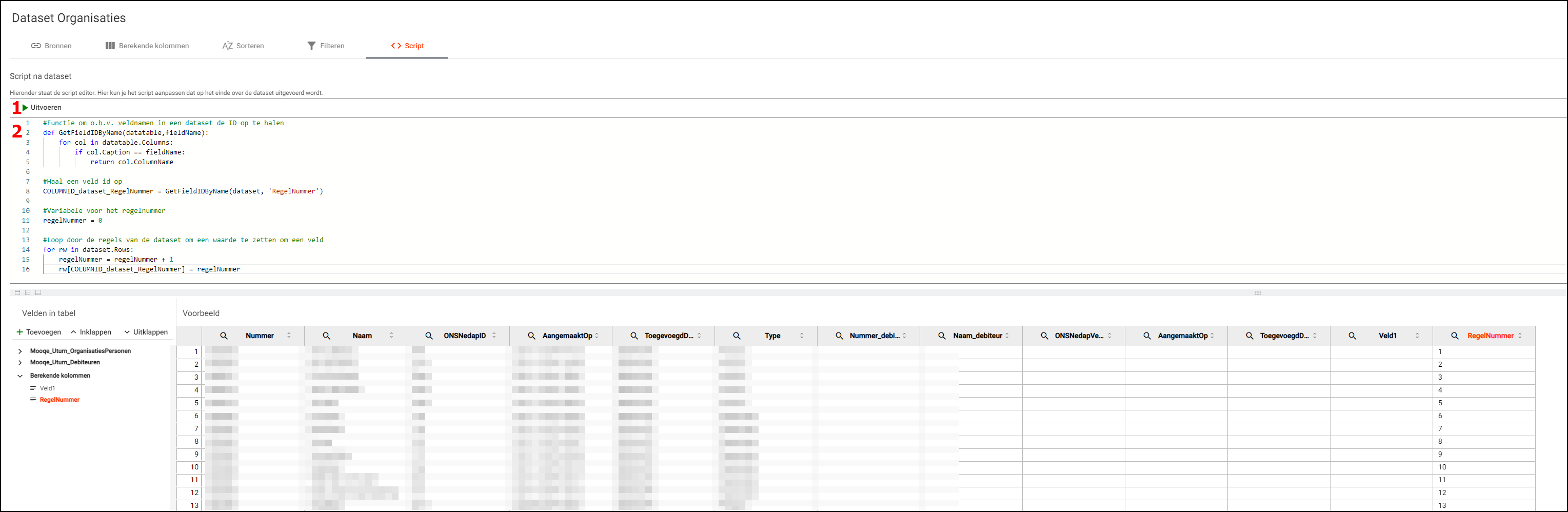 Met de uitvoeren knop kan het script getest worden. Dit verstuurt niets naar andere applicaties, het is puur het toepassen van het script om de data in de dataset