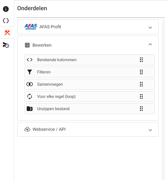 De toolbox bestaat uit een verticale menubalk met daarin vier tabbladen. De tabbladen zijn: