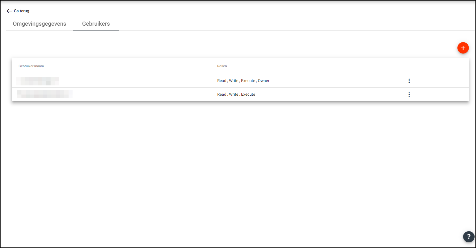Op deze tab worden de aan de omgeving gekoppelde gebruikers getoond inclusief de toegekende rollen. Aan het einde van iedere regel staan 3 puntjes. Vanuit dit menu kunnen extra acties op de gebruiker worden uitgevoerd.