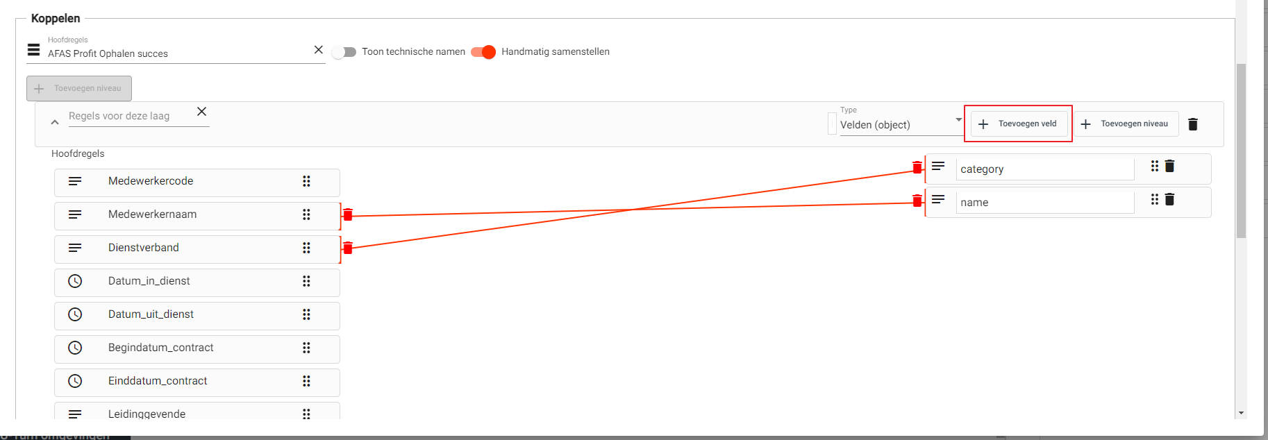 Wanneer dit gedaan is klik je op ‘Toevoegen niveau’ om een niveau aan de body toe te voegen. Vervolgens kan met ‘Toevoegen veld’ de gewenste velden toegevoegd worden. Geef het veld de naam die de documentatie voorschrijft en koppel deze aan een veld uit de dataset.