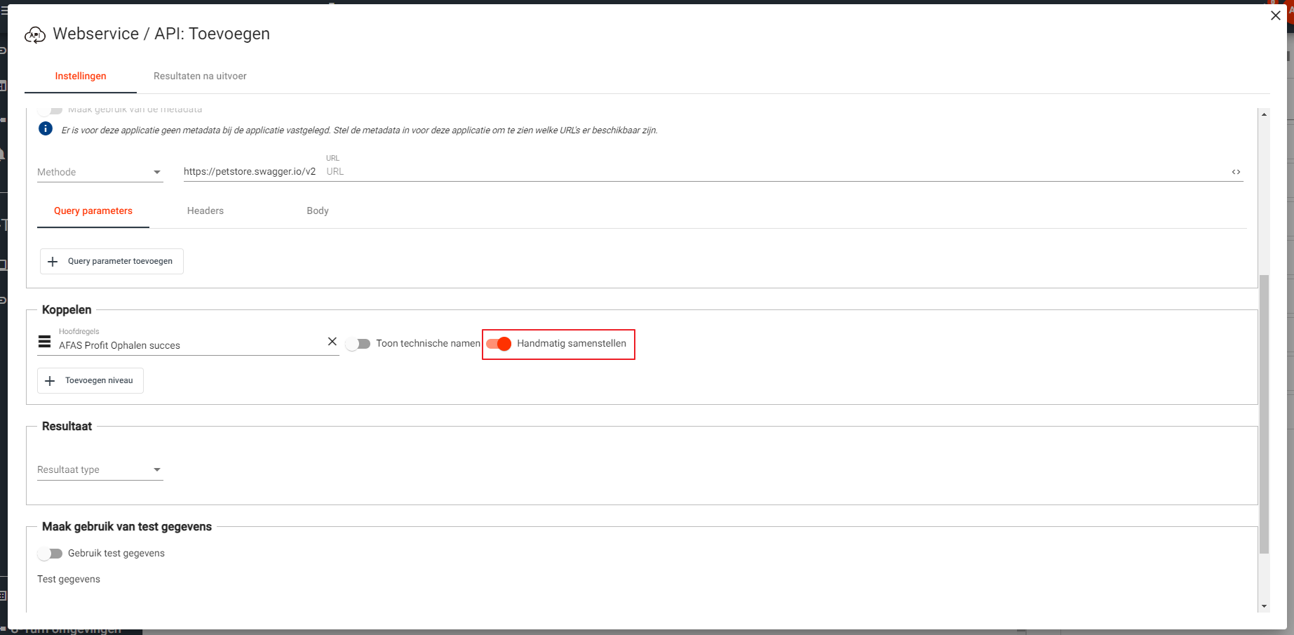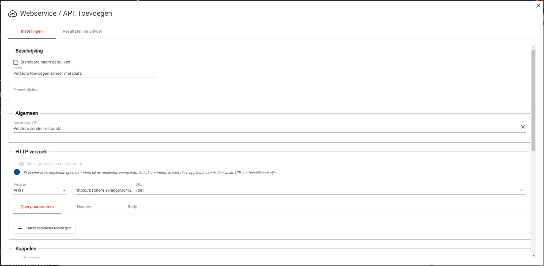Wanneer je data wil versturen zonder dat hiervoor metadata vastgelegd is, is het alsnog benodigd om deze aan te maken als applicatie. Het is niet mogelijk om in een U-Turn Studio koppeling volledig zelf je request samen te stellen zonder deze als applicatie vast te leggen.