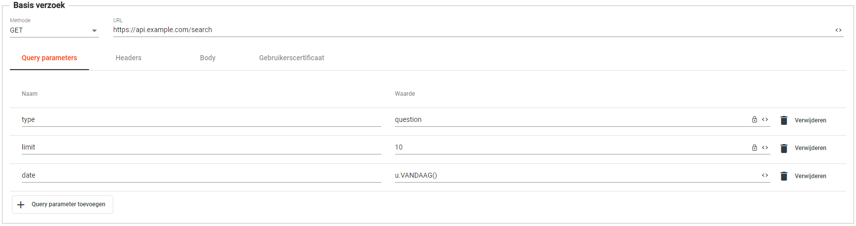 Voor dynamische query parameters, bijvoorbeeld om een dynamische datum mee te sturen, kan je het invulformulier voor de query parameters gebruiken.