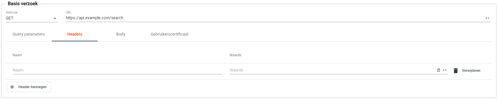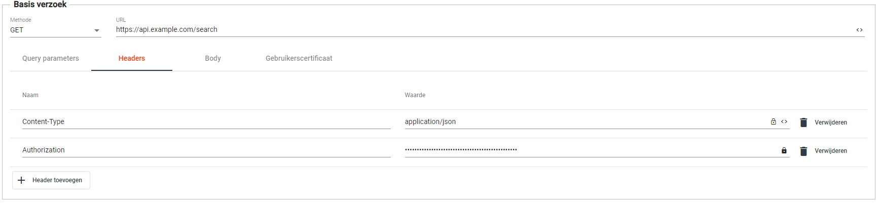 Klik op de knop ‘+ Header toevoegen’ om een nieuwe header toe te voegen aan je HTTP verzoek. Veelvoorkomende headers zijn bijvoorbeeld ‘Accept', ‘Content-Type’ en 'Authorization’.